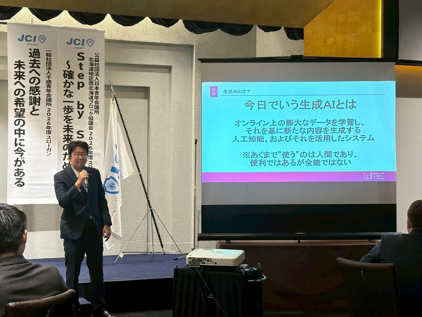 本例会では、講師に札幌青年会議所OBである三田健太先輩をお招きし、急速に進化するAI技術をいかにして私たちの生活やビジネスへの影響、そして青年会議所活動に役立てるかをテーマにご講演いただきました。